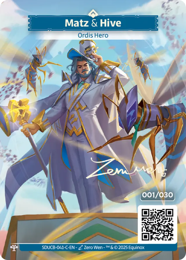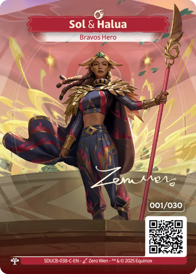 Pour les plus collectionneurs d’entre-vous, nous introduisons également nos premières cartes sérialisées : un total de 30 cartes numérotées par héros de l’édition, là encore exclusives aux Collector Boosters. Il s’agit de versions Émissaires Full-art des héros de Seeds of Unity, sérialisées (il n’en existe qu’un unique exemplaire de chaque numéro), dédicacées avec la signature digitale en doré de leurs artistes.