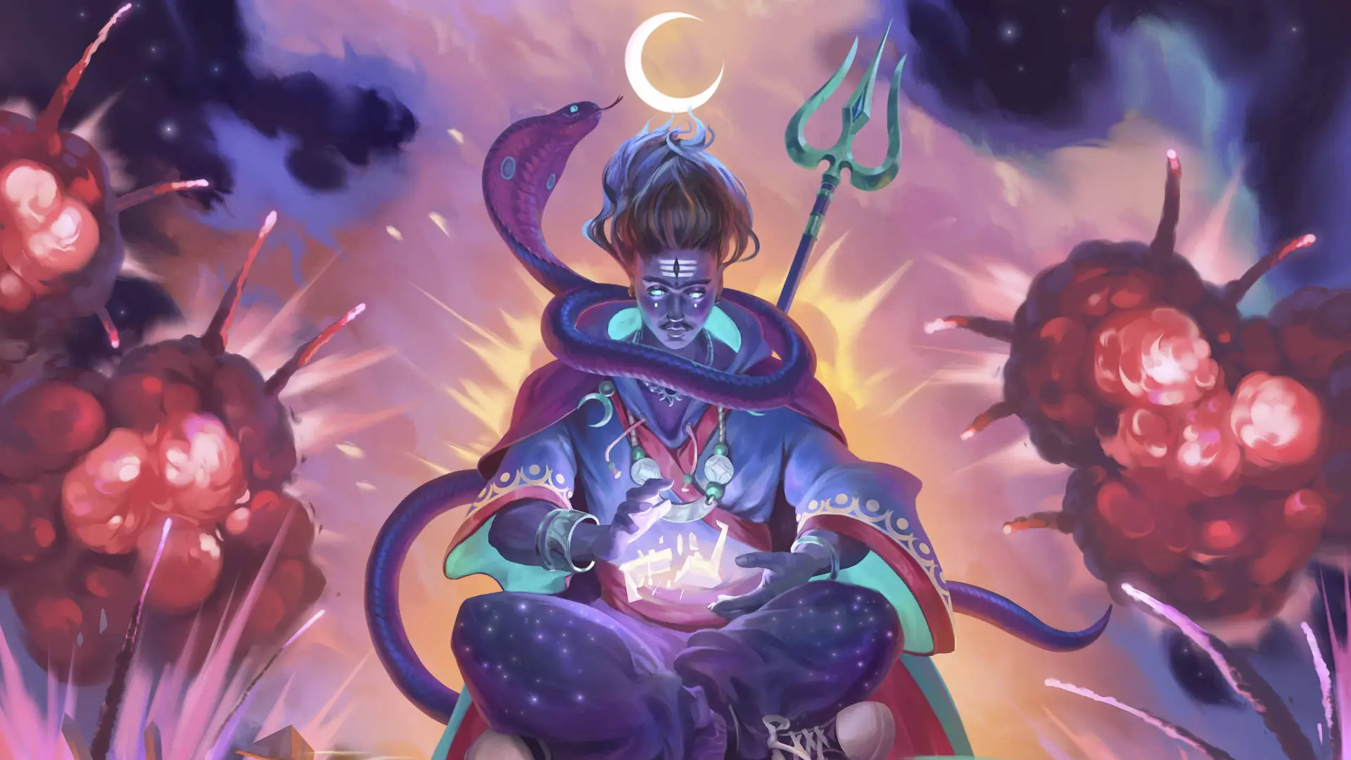 Mes mains se crispent et Shiva manifeste soudain ses nombreux bras, en signe de défiance et de pouvoir. Le mage masqué ne semble pas plus impressionné que cela.
