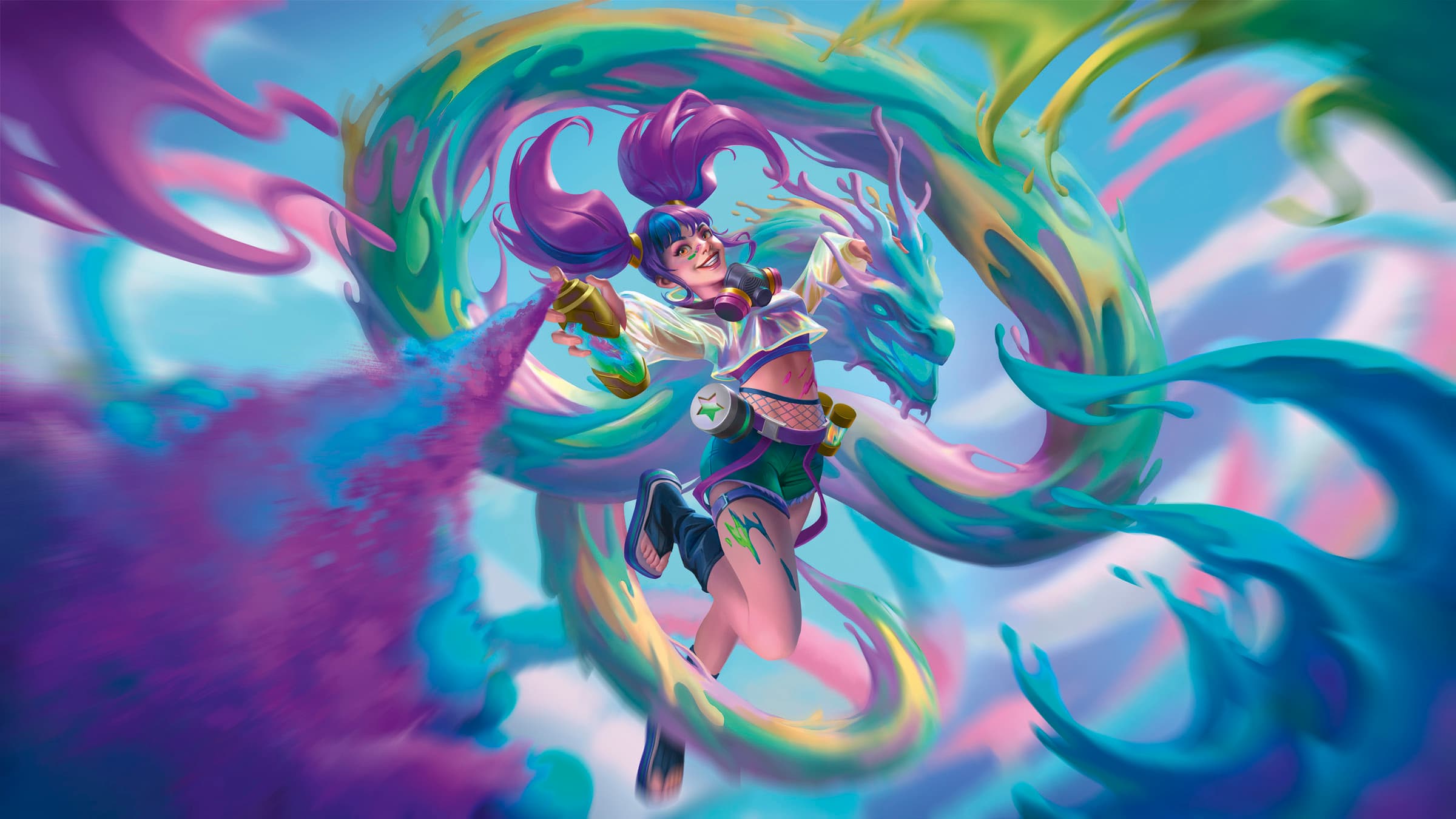 Alors qu'elle déambulait sous les puissantes cheminées de Brume, elle vit un amas coloré (on peut pas le décrire mieux que ça) virevolter dans les nuages. C'était comme un serpentin créé à partir d'un arc en ciel (ah si, on peut) : un dragon de teintes et de nuances, comme si des nuages étaient devenus peinture, et que cette peinture était devenue créature draconique qui tabasse tellement elle est cool. Nev la regarda dériver dans le ciel, tournoyer autour des puits de fumée. Pour se rapprocher de l'entité, elle escalada les échelles vertigineuses et enjamba les rambardes protectrices, flirtant dangereusement avec le vide.