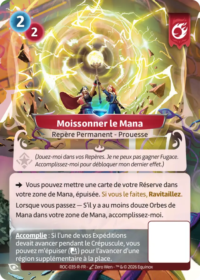 Certaines Prouesses peuvent même orienter entièrement votre plan de jeu. Reap the Mana, par exemple, vous pousse à accumuler une réserve massive de mana afin de déclencher plusieurs avancées décisives en fin de partie. D’autres cartes viennent capitaliser sur vos exploits déjà accomplis : Spry Scout révèle tout son potentiel si vous contrôlez une Prouesse, gagnant un bonus qui récompense directement votre montée en puissance.