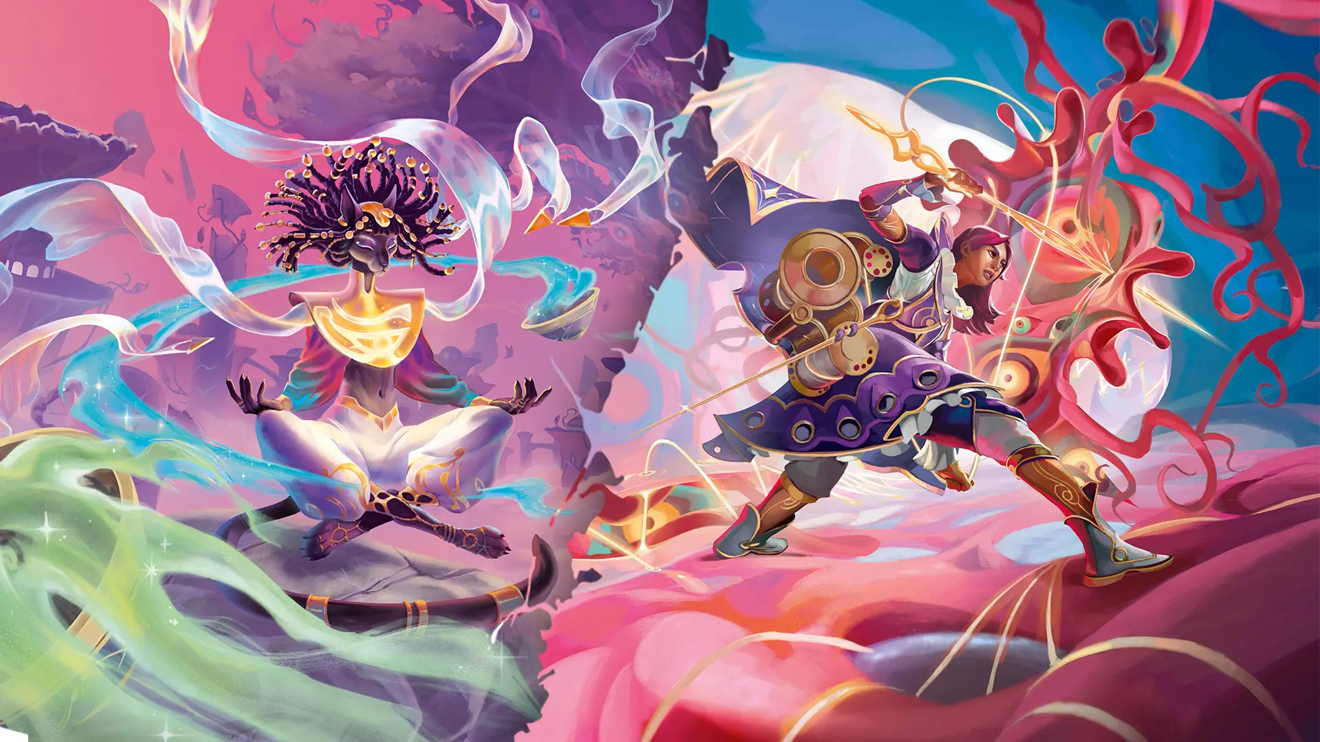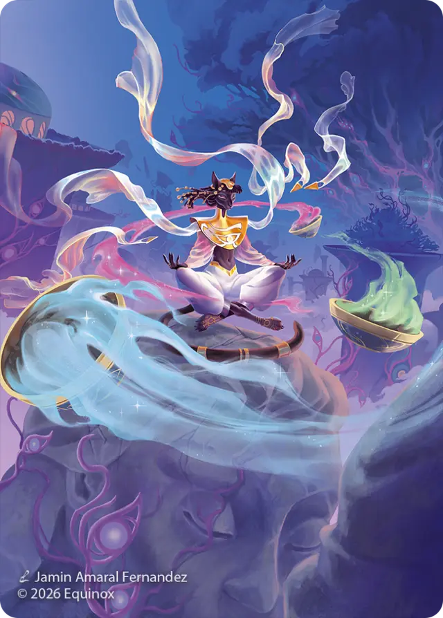 Dans cette extension d'Altered les Lyra virtuoses manient les bâtons d'encens comme une harpe ou un pinceau. En dessinant de la fumée sur toutes les cartes, l'équipe artistique a souhaité montrer que tous les membres de la faction participaient ensemble à l'effort. Si pour bannir la corruption l'encens a remplacé la peinture ou le chant, c'est parce qu'on lui reconnaît des vertus curatives et purificatrices tout autour du monde. De cette façon, les joueurs et joueuses saisissent plus facilement l'effet de cette fumée sur la corruption.