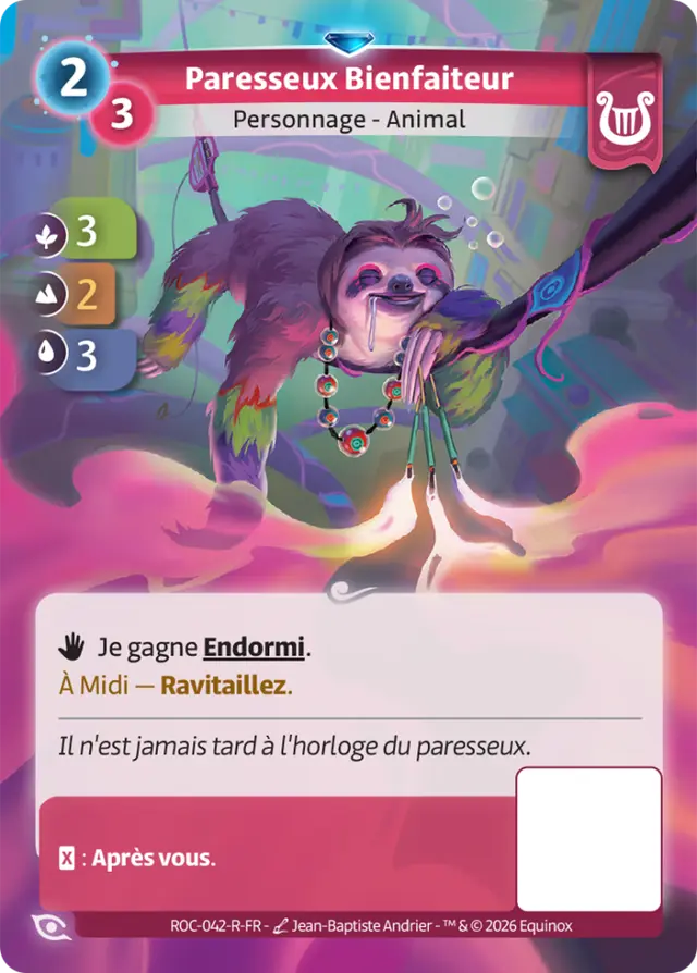Dans cette nouvelle extension, Lyra revient avec Yeong-Yi et son fidèle Amber, un duo qui mêle aléatoire et effets de Support avec une précision déroutante. Chaque tour vous confronte à des choix clés : jouer vos personnages pour asseoir votre présence, ou les défausser pour activer leurs capacités de Support, tout en sélectionnant la cible idéale pour le pouvoir de votre Héros. Bestowing Sloth illustre parfaitement cette dynamique : endormi à son arrivée, il reste en jeu deux journées, offrant une fenêtre idéale pour être ciblé par Yeong-Yi et déclencher son Support au moment opportun. Lakshmi’s Owl, quant à lui, trouve toute sa valeur lorsque vous lancez un dé grâce à votre Héros, transformant l’aléatoire en véritable opportunité.