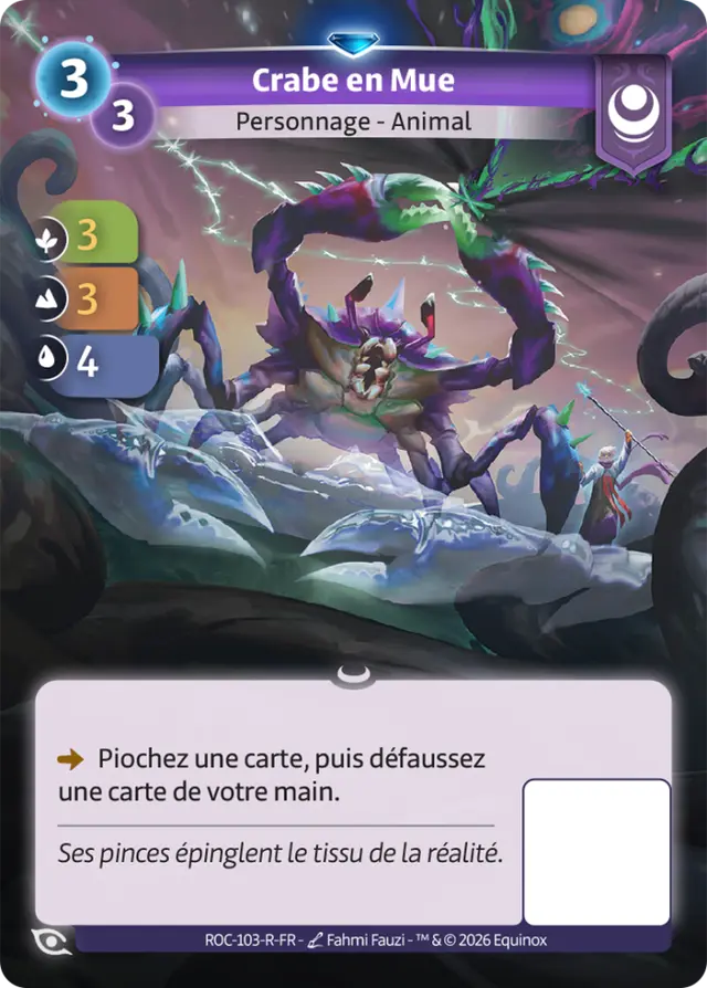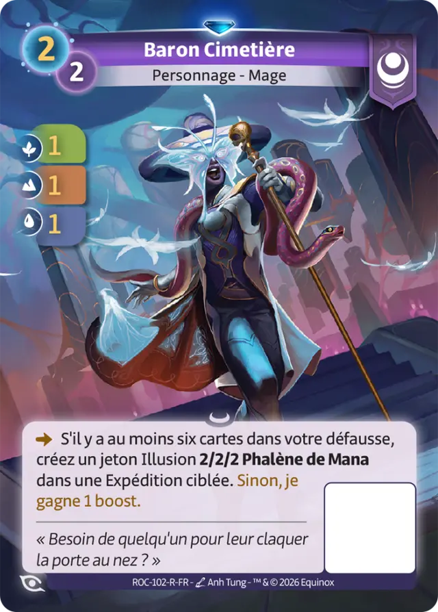 Pour y parvenir, vous devrez alimenter activement votre cimetière. Des cartes comme Molting Crab accélèrent votre plan de jeu en vous permettant de défausser efficacement depuis votre main, tandis que d’autres, à l’image de Baron Cimetière, vous récompensent généreusement une fois le seuil atteint. Plus votre défausse se remplit, plus vos menaces deviennent oppressantes.